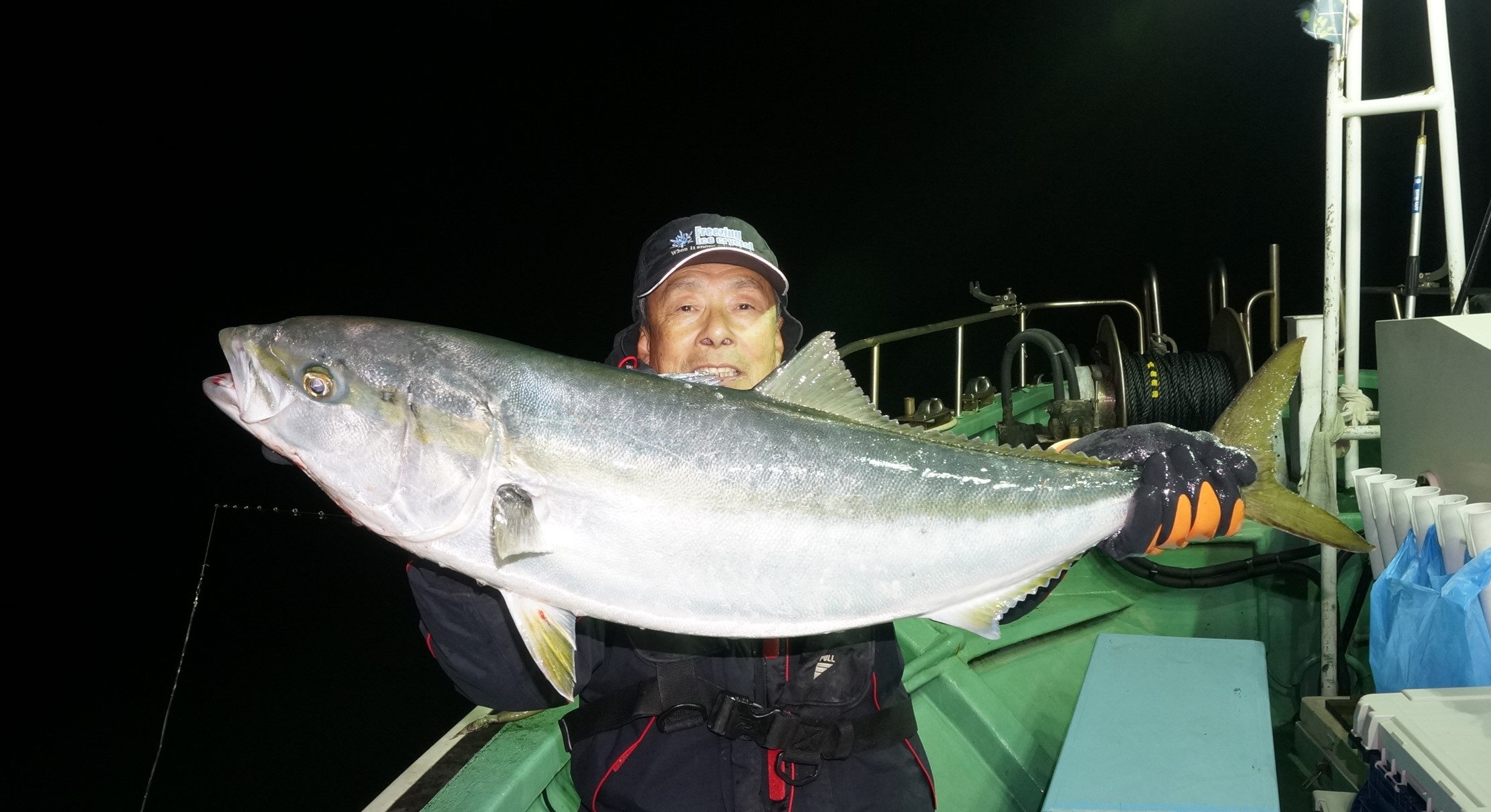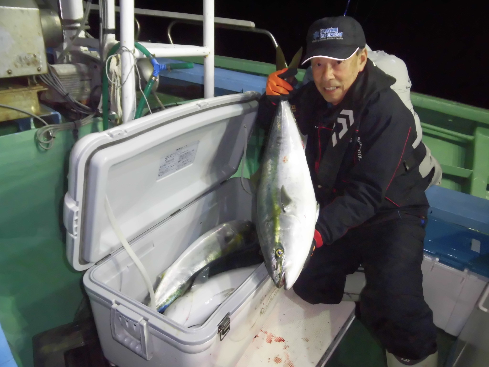 2025年11月23日粟島沖夜ブリ真鯛釣り釣果 つり情報 2025年11月24日 本日天候回復、月山も、雪景色に、流れ魚影良く、初めから大型ブリ8〜14k、ワラサ4k~5k入れ食い状態に、 第三恵陽丸、第八恵陽丸、とも大爆釣大漁、PM20時半、沖上がりしました。 本日も、随行人数に、なれば出船します、御予約お待ちしております。 月山も、雪景色に